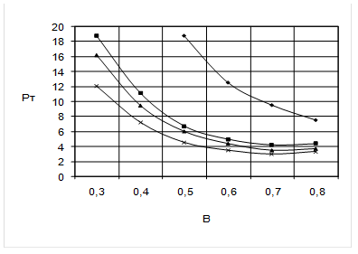 Рис. 2.5. Зависимость Рт от B для сердечника К12´5´5.5. 2.3.4. По графикам (рис. 2.3.-2.5.), при каждом значении 0 , определили Ртопт - минимальную величину Рт . Если график имеет минимум при DВ>DВm , то за Ртопт приняли значение Рт соответствующее DВm . Найденные значения Ртопт и вычисленные в п.2.3.1. величины Рт.макс. заносли в таблицы 2.7.-2.9.. Таблица 2.7. Сердечник 2К10´6´3 Рт, Вт.