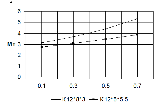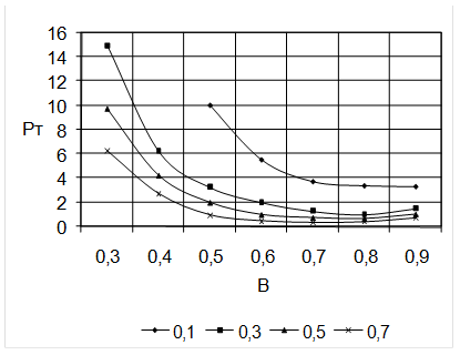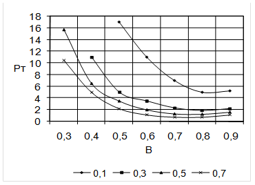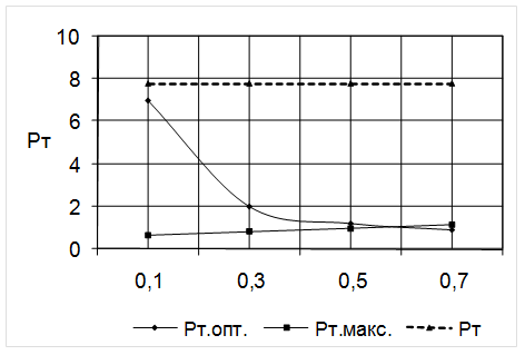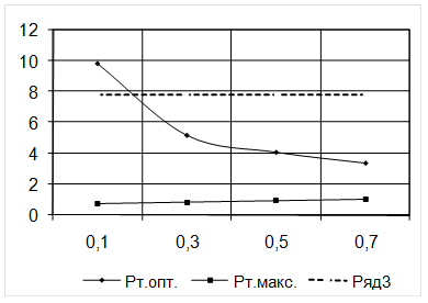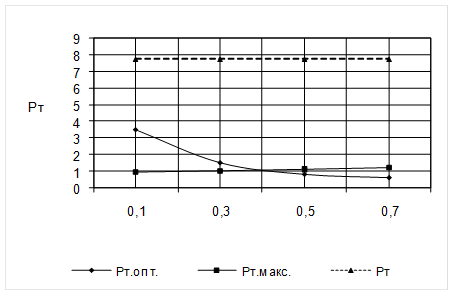При 0 =0,1 PТмакс =3,14´1,2´10-3 /1.4´(130-40)´4,71=0,7498 Для других 0 расчет аналогичен. Данные расчета занесены в таблицу 3.1. Таблица 3.1. Зависимость максимальной мощности потерь трансформатора от 0 , мВт