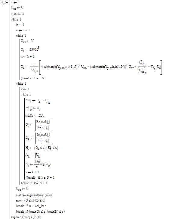 Результаты решения нелинейных уравнений узловых напряжений в форме баланса мощностей в полярной системе координат в среде MathCAD методом Ньютона, а так же сама программа расчета, приведены в Приложении.