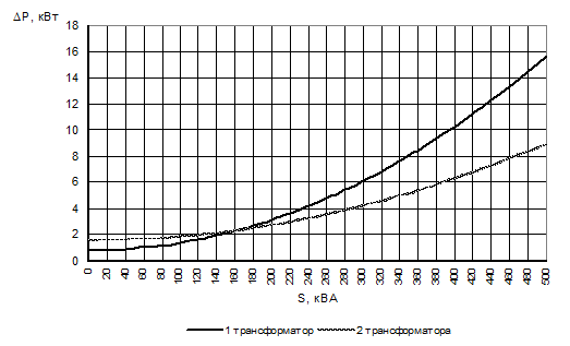 По табл. 1 выбирается трансформатор По формулам (6) и (7) рассчитываются зависимости потерь от нагрузки при одном и двух, параллельно работающих трансформаторах. Результаты расчета сводятся в табл. 2. Таблица 2 Расчет потерь мощности в трансформаторе