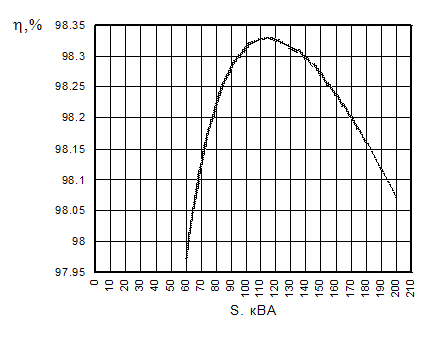 Рис.11. Оптимальное число включенных трансформаторов Зависимость коэффициента полезного действия от нагрузки рассчитывается по формуле (4). Коэффициент мощности принимается равным 0,8. Результаты расчета сводятся в табл.4. Таблица 4 Расчет КПД трансформатора