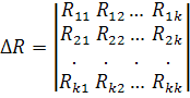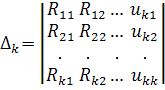 Для контурных токов ik 1, ik 2 и ik 3 запишем уравнения по ЗНК: -u1 +(R1 +R3 +R5 )ik1 -R3 ik2 +R5 ik3 =0; (1) u2 -R3 ik1 +(R2 +R3 +R4 )ik2 +R2 ik3 =0; (2) u2 +R5 ik1 +R2 ik2 +(R6 +R2 +R5 )ik3 =0. (3) Перенесём u 1 и u 2 в правую часть системы и получим каноническую форму записи уравнений по методу контурных токов. R 11 ik 1 -R 12 ik 2 +R 13 ik 3 =u 1 ; (4) -R 21 ik 1 +R 22 ik 2 +R 23 ik 3 = -u 2 ; (5) R 31 ik 1 +R 32 ik 2 +R 33 ik 3 = -u 2 . (6) Где собственными или контурными сопротивлениями 1, 2 и 3 контуров являются формулы (7), (8) и (9). R11 = R1 +R3 +R5 ; (7) R22 = R2 +R3 +R4 ; (8) R33 = R6 +R2 +R5 . (9) А взаимным сопротивлением – (10), (11) и (12). R 12 =R 21 =R 3 ; (10) R 13 =R 31 =R 5 ; (11) R 23 =R 32 =R 2 . (12) Из данной системы уравнений получаем определитель системы (13), а определитель