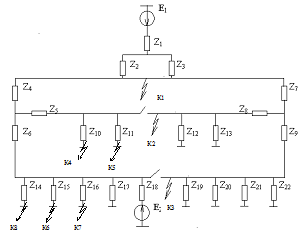 Параметры силовых трансформаторов: Xв =0.5/100(Uк,в-с +Uк,в-н -Uк,с-н )= 0.5/100(10.5+17.5-6.5)=0.11 ; (5.4) Xс =0.5/100(Uк,в-с +Uк,с-н -Uк,в-н )= 0.5/100(10.5+6.5-17.5)= - 0.0025 ; (5.5) Xн =0.5/100(Uк,в-н +Uк,с-н -Uк,в-с )= 0.5/100(17.5+6.5-10.5)=0.068 ; (5.6) X4 = X7 = Xв ×Sб ×U2 н,вн /Sн ×U2 б,вн =0.11×700×1152 /10×1152 =7.7 ; Z4 = Z7 =X4 =7.7 ; X5 = X8 = Xc ×Sб ×U2 н, c н /Sн ×U2 б, c н = - 0.0025×700×38.52 /10×38.52 = - 0.175 ; Z5 = Z8 =X5 = - 0.175 ; X6 = X9 = Xн ×Sб ×U2 н,нн /Sн ×U2 б,нн =0.068×700×112 /10×112 =4.76 ; Z6 = Z9 =X6 =4.76 . Параметры КУ: Z19 =X19 =0.5×Sб ×U2 н,нн /Qку ×U2 б,нн =0.5×700×112 /0.45×112 =777 ; (5.7) E2 =E3 »1.06 . Параметры ТСН : Z14 = Z22 = X14 = X22 ; X14 = (Uк% /100)×Sб ×U2 н,нн /Sном,тр-ра ×U2 б,нн =(4.5/100)×700×112 /0.1×112 =500 . (5.8) Все сопротивления схемы замещения сведены в таблицу 5.1 Таблица 5.1 Значения сопротивлений схемы замещения
