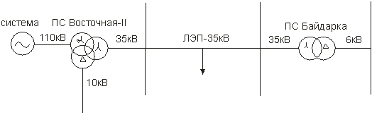 Рисунок 10.1 – схема электроснабжения подстанции «Байдарка» 10.2 По схеме электроснабжения составляем расчетную схему, в которую входят все участвующие в питании короткого замыкания источники питания и все элементы схемы электроснабжения. При выборе расчетной схемы учитываем режимы работы данной установки . На расчетной схеме расставляем характерные точки короткого замыкания.