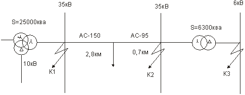 Таким образом, замена масляного выключателя на вакуумный выключатель позволяет получить ежегодную экономическую экономию576,31 т. рублей. Это объясняется снижением затрат на эксплуатацию. Дополнительные капитальные вложения окупятся за 3,5 года. 10 Расчет токов короткого замыкания Расчет токов короткого замыкания (к.з.) необходим для выбора аппаратуры и проверки элементов электроустановок (шин, изоляторов, кабелей и т. д.) на электродинамическую и термическую устойчивость, проектирования и наладки релейной защиты, выбора средств и схем грозозащиты, выбора и расчета токоограничивающих и заземляющих устройств. [14] 10.1 Изобразим схему электроснабжения подстанции «Байдарка»