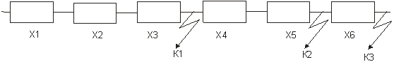 Рисунок 10.3 – схема замещения Х1 – сопротивление системы Х2 – сопротивление стороны 110 кВ на подстанции «Восточная II» Х3 – сопротивление стороны 35 кв на подстанции «Восточная II» Х4 – сопротивление линии 35 кВ на участке с проводом АС-150 Х5 – сопротивление линии 35 кВ на участке с проводом АС-95 Х6 – сопротивление трансформатора на подстанции «Байдарка» 10.4 Данные для расчета на подстанции «Восточная II» предоставлены региональным диспетчерским управлением Еэкв =125,99 кВ Х1=6,561 Ом Iк.з. =10,598 кА Трансформатор на подстанции «Восточная II» имеет следующие напряжения короткого замыкания: Uк В-С =10,5% - напряжение короткого замыкания между сторонами высокого и среднего напряжения Uк В-Н =17% - напряжение короткого замыкания между сторонами высокого и низкого напряжения Uк С-Н =6% - напряжение короткого замыкания между сторонами среднего и низкого напряжения 10.5 Определяем напряжение короткого замыкания на высокой стороне Uк В =0,5×( Uк В-Н + Uк В-С - Uк С-Н ) (10.1) Uк В =0,5×(17+10,5 – 6)=10,75 % 10.6 Определяем напряжение короткого замыкания на стороне среднего напряжения Uк С =0,5×( Uк В-С + Uк С-Н - Uк В-Н ) (10.2) Uк С =0,5×(10,5+6 – 17)=-0,25 % 10.7 Так как активное сопротивление более чем в три раза меньше индуктивного то в расчетах им пренебрегаем и учитываем только индуктивное сопротивление [7]. Трансформатора на подстанции «Восточная II» имеет напряжения 115/38,5/11 10.8 Определяем индуктивное сопротивление высокой стороны трансформатора на подстанции «Восточная II»