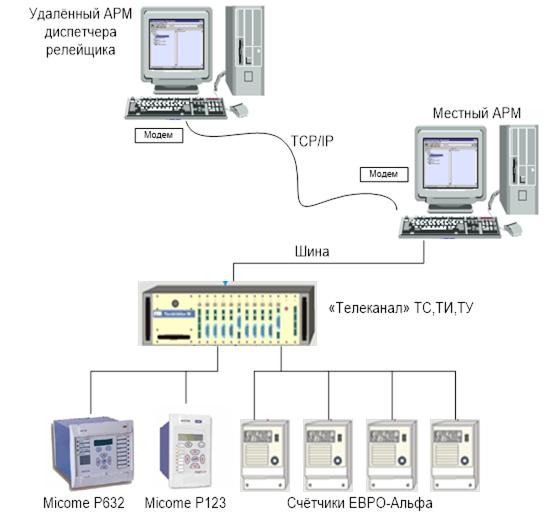 4.7 Выводы по главе 4Данная глава посвящена выбору и расчету релейной защиты и противоаварийной автоматики. Для трансформаторов и линии согласно техническому заданию установили устройства релейной защиты на микропроцессорной основе. Одним из главных достоинств микропроцессорных реле защиты является осуществимость реализации целого ряда функций и характеристик. Для выборы необходимых нам микропроцессорных блоков в главе проведено сравнение нескольких видов микропроцессорных устройств. Для установки на подстанции «Гежская» предусмотрены терминалы Micom Р123 и Р632. Micom Р123 устанавливаем по низкой стороне трансформатора и секционного выключателя. Дифференциальная защита осуществляем на терминале Micom Р632. Особенность дифференциальной защиты трансформатора в том, что используется 2 комплекта трансформаторов тока, расположенных с обеих сторон трансформатора. Выравнивание вторичных токов по величине и по фазе производится защитой автоматически расчетным путем, при этом возникает возможность собрать трансформаторы тока со всех сторон в «звезду», что снижает нагрузку вторичных цепей. Чувствительность защит удовлетворяет условиям ПУЭ. Для повышения надёжности и бесперебойности работы систем электроснабжения применили противоаварийную автоматику (АПВ и АВР). Функцию АПВ и АВР выполняют микропроцессорные устройства защиты и автоматики фирмы «ALSTOM », содержащуюся в программной логической части. Глава 5. СИСТЕМА АВТОМАТИЗАЦИИ ДИСПЕТЧЕРСКОГО УПРАВЛЕНИЯВнедрение систем автоматизации и диспетчерского управления на современной цифровой технике коренным образом повышает качество и надежность процессов производства, передачи и распределения электроэнергии. В настоящее время существует множество систем специально разработанных для решения задач автоматизации и диспетчерского управления. В результате оснащения энергообьектов системами автоматизации, микропроцессорными средствами противоаварийной автоматики и релейной защиты достигается существенный экономический эффект за счет оптимизации режимов производства, передачи и распределения электроэнергии, предотвращения аварийных ситуаций и минимизации ущерба в случае их возникновения. Следует учесть, что на подстанции применены новые типы панелей защиты и автоматики Micom , которые позволяя.n ликвидировать короткие замыкания в сети за минимальный промежуток времени с требуемой селективностью и высокой надёжностью отключения основного оборудования, а также дают возможность не только отслеживать в реальном времени показатели работы всего технологического комплекса подстанции, но и на основе принятой концепции построения системы диспетчерского и технологического управления организовывать автоматизированное рабочее место для релейного персонала, позволяющее вести единую базу данных событий с последующим ретроспективным анализом аварийных ситуаций, произошедших на данном оборудовании. По своему принципу построения все АСУ делятся на два типа: одноуровневые и многоуровневые. Различия между двумя этими типами следующее: в одноуровневой системе вся информация с конечных устройств поступает в один компьютер и не передается дальше, в многоуровневых системах вся информация собранная одним компьютером (или несколькими ПК) передается на следующий уровень, т
