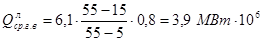 де 350 – число робочих діб системи гарячого водопостачання у році з урахуванням 15-денної перерви на ревізію та ремонт теплових мереж. За формулою (1.12), прийнявши, що норма витрати води в кілограмах при температурі 55 °С для житлових будівель на одну людину за добу ал =115 кг/люд. доба, температура холодної води tx.в =10 °С визначаємо витрату теплоти на гаряче водопостачання:
