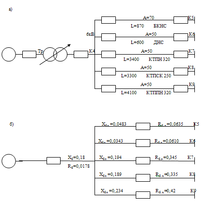 Расчет токов к.з., ударных токов, мощностей к.з. в расчетных точках, приведен в табл. 2.3. Для расчетов токов к.з. на стороне низкого напряжения п/с "Шершнёвская" используем параметры и схему изображенную на рис. 2.5(а). Схема замещения приведена на рис. 2.5(б). Результаты расчетов токов к.з., ударных токов, мощностей к.з. в расчетных точках приведены в табл. 2.3.