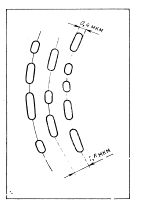 Мал.1. Схематичне зображення мікропоглиблень на лазерному диску; ширина поглиблень 0,4 мкм, відстань між доріжками 1,6 мкм. Лазерно-оптичне зчитування інформації. За допомогою цього способу в приладі, аналогічному програвачу, відтворюється неконтактним способом записана на диску інформація (діаметр дисків до 30 см), причому застосовуються лазерні диски тільки для зчитування, наприклад відеодиски, компакт-диски. Принцип дії. Кодування інформації відбувається шляхом створення інформаційних мікропоглиблень, що мають різну довжину й різні відстані між ними. Інформація на диску зберігається, таким чином, у цифровій формі, записаній по спіралі, що складається з інформаційних ямок (мал.1). Лазерний відеодиск характеризується наступними параметрами: відстань між двома профілюючими доріжками 1,6 мкм; ширина поглиблення 0,4 мкм; максимальна довжина поглиблення 3,3 мкм;