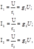 де g1 , g2 i g3 – провідності віток. За першим законом Кірхгофа І=І1 +І2 +І3 , тому з урахуванням закону Ома отримаємо: