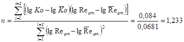 Статистическая обработка данных После обработки опытных данных по теплоотдаче для всех исследованных в работе режимов по числу Рейнольдса устанавливается функциональная связь между числами Nu и Re в виде зависимости (6). Наиболее обоснованным и широко распространенным в практике научных исследований видом аппроксимации опытных данных является метод «наименьших квадратов», связанный со статистическим законом распределения случайных ошибок эксперимента. Сущность метода заключается в том, что он обеспечивает минимальное значение суммы квадратов отклонений опытных точек по вертикали от расчетной зависимости, описывающей экспериментальные данные. Применим данный метод для окончательной обработки результатов экспериментов, используя значение показателя степени m при комплекса. D, полученное ранее. (Следует заметить, что m, как правило, значительно меньше n и погрешность в определении m не сказывается существенно на результатах расчетов чисел Nu.). Запишем зависимость в виде:
