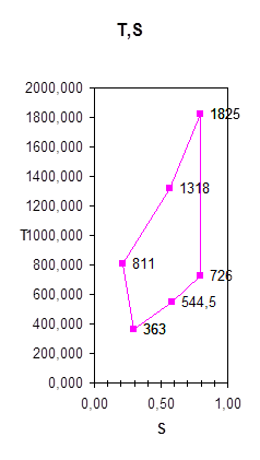 4 Определение l ц, η , P lц = 422,8 кДж/кг qподв =732,11 кДж/кг η =lц / qподв= 422,8/732,11 = 0,578 = 57,8 % Pi=lц / Vmax - Vmin= 422,8∙103/(1,042- 0,104) = 0,451 МПа 5 Расчет промежуточных точек 1.Для графика в P-V координатах: а) по оси V 1.Vχ1=(V1 + V2)/2=(1,042+0,104)/2=0,572 2.Vχ2=(V3 + V4)/2=(1,042+0,104)/2=0,572 б) по оси Р 1.Рχ1=Р1*(V1/Vχ1)n=1*105*(1,042/0,572)1,35=2,247*105 2.Рχ2=Р3*(V3/Vχ2)к=50,37*105*(0,104/0,572)1,4=4,63*105 2.Для графика в T-S координатах: а) по оси Т 1.Тχ1=(Т2+Т3)/2=(811+1825)/2=1318 2.Тχ2=(Т3+Т4)/2=(1825+726)/2=1275,5 3.Тχ3=(Т4+Т1)/2=(726+363)/2=544,5 б) по оси S: а)2-3Pχ1=P2*(Tχ1/T2)=22,387*105*(1318/811)=36,38*105 б)3-4Pχ2=P3*(Tχ2/T3)= 50,37*105*(1275,5/1825)=35,20*105 в)4-1Pχ3=P1*(Tχ3/T1)= 1*105*(544,5/363)=1,5*105 1.Sχ1=Cp*ln(Tχ1/273)-R(Pχ1/1,013)=1,01*ln(1318/273)-0,287* *ln(36,38/1,013)= 0,562 2.Sχ2=Cp*ln(Tχ2/273)-R(Pχ2/1,013)=1,01*ln(1275,5/273)-0,287* *ln(35,20/1,013)= 0,659 3.Sχ3=Cp*ln(Tχ3/273)-R(Pχ3/1,013)=1,01*ln(544,5/273)-0,287* *ln(1,5/1,013)= 0,585