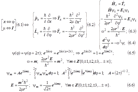 Состояние с нулевой энергией у «ящика» не существует! Далее было бы полезно обсуждение задач, для решения которых особенно полезна модель одномерного «ящика». 6.2. Плоский ротатор - простейшая модель вращения в плоскости. Условие однозначности состоит в повторяемости значений волновой функции через 2p. Удобно выразить волновые функции плоского ротатора в комплексной форме. Формула оператора момента импульса в плоском вращении, подобна формуле оператора импульса поступательного движения.