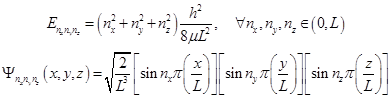 6.3.1. О характеристичности молекулярных колебаний. Колебания различных химических связей обладают высокой степенью индивидуальности. Это свойство называют характеристичностью. В колебательных спектрах частота и нередко даже графический вид колебательной полосы (или линии) поглощения какой-то определённой химической связи или группы (органического алкильного радикала или иного молекулярного фрагмента) хорошо воспроизводятся в спектрах различных молекул, содержащих эти группы атомов. Эта индивидуальность является основой аналитического применения колебательной спектроскопии. Характеристики молекулярных колебаний можно получить с помощью различных методов спектроскопии инфракрасного (ИК) поглощения или спектроскопии комбинационного рассеяния (КР). Диаграмма энергетических уровней и графики волновых функций осциллятора. Уровни гармонического осциллятора согласно (6.8) эквидистанты, и соседние (Dv=1) отстоят на hn, где n собственная частота молекулярного колебания. 6.4. Качественное сравнение волновых функций одномерного ящика и осциллятора выявляет их качественное сходство. Число пучностей и узлов волновых функций увеличивается с номером уровня. Это свойство общее для всех квантовых систем. 6.5. Трёхмерный потенциальный «ящик». Модель одномерного «ящика» легко обобщается для трёхмерного движения в замкнутом пространстве параллелепипеда или куба. Рассмотрим для простоты куб с ребром L . Переменные независимы, и гамильтониан вида