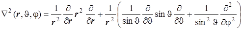 Простейшее дифференциальное уравнение, в котором лапласиан играет основную роль - уравнение Лапласа. Это дифференциальное уравнение в частных производных второго порядка. В различные квантово-механические задачи о сферических системах лапласиан входит в качестве основного оператора. Симметрия конкретной системы предопределяет вид координат, к которым следует преобразовать лапласиан, а далее и вид решений тех дифференциальных уравнений, у которых уравнение Лапласа можно выделить в качестве однородной части. Таковы задачи о сферически симметричных движениях. В шаровых координатах лапласиан оказывается составленным из трёх независимых компонент-операторов, каждый из которых преобразует лишь одну из трёх независимых пространственных переменных. 6.6.3. Перевод лапласиана в шаровые координаты можно осуществить, используя различные схемы. В сферических координатах он выглядит довольно внушительно, но при ближайшем рассмотрении оказывается достаточно простой конструкцией. Несложные, но длительные, преобразования приводят к следующей формуле: