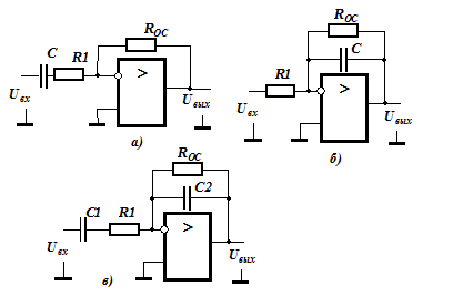 Ведем конденсатор параллельно резистору в цепь обратной связи инвертирующего усилителя (рисунком 8.9,б). Используя подходы, аналогичные предыдущим, получим