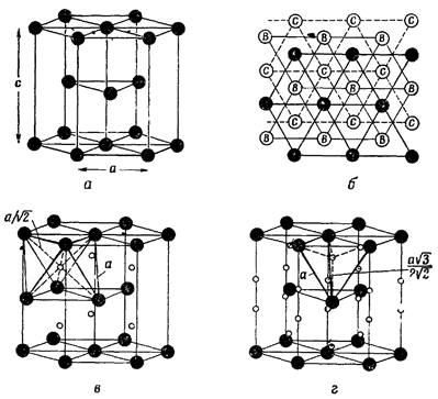 Рисунок 1.2 - Кубічна об’ємноцентрована решітка [1]: а - елементарний осередок; б - напрямки найщільнішого упакування в площинах (110); в - октаедричні порожнечі; г - тетраедричні порожнечі. Відмітимо, що впровадження атома з радіусом більше 0,291r у тетраедричну пору повинне привести до зсуву всіх чотирьох навколишніх атомів, тоді як впровадження атома відповідно великих розмірів в октаедричну пору буде приводити до зрушення тільки двох атомів у напрямку, рівнобіжному ребру куба елементарного осередку, що викликає появу напруг, релаксація яких може відбуватися за рахунок розширення ґрати тільки в цьому напрямку. Саме цим, очевидно, порозумівається тенденція міжвузільних атомів вуглецю в решітках α - заліза займати октаедричні міжвузля. У кубічної об’ємноцентрованої ґратки немає щільноупакованих площин, подібних площині (111) у решітках ГЦК. У даному випадку найбільш щільноупакованими є дванадцять площин (110) (рис.1.2,б). У цих площинах мається два напрямки, уздовж яких тверді кулі будуть стикатися. Перейдемо до гексагональної щільно упакованої решітки. Вона складається з окремих шарів, причому так, що кожен атом будь-якого шару оточений шістьма розташованими на рівних відстанях атомами, які належать цьому ж шару, і, крім того, має по трьох найближчих сусіда в шарах, розташованих вище і нижче даного шару (рис.1.3,а) [1]. У такої комірки відстані позначається через а, висота ж позначається як с. Шість найближчих сусідів, розташованих у суміжних шарах, будуть також знаходитися на відстанях а від даного атома – це при умові що відношення с/а = 1,6330. У такої комірки координальне число буде дорівнювати 12, і вона буде називатися ідеальною щільноупакованою. Відмітимо, що більшість металів, які мають так структуру, мають відношеня параметрів с/а в інтервалі 1,56-1,63, тобто трохи менше ідеального значення. Гексагональна щільноупакована структура також як і інші структури має порожнечі. Цих порожнеч два типи: октаедричні порожнечі (рис. 1.3, в), тетраедричні порожнечі (рис. 1.3, г). Вони розташовані в центрах правильних октаедрів або тетраедрів, тобто в такий же спосіб, як і у випадку кубічної гранецентрованої решітки.