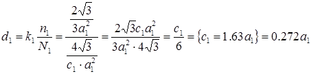 де d = n/N - відстань між атомними шарами, паралельними підкладці [4]. Приведемо розрахунок d* для конкретного фазового переходу (111)ГЦК(2) → (100)ГЩП(1). Знайдемо усі необхідні параметри для формули 2.6: 1. З умови відомо, що a1 = 0.323 нм. 2. Об’ємне координаційне число z01 та z02 – це число найближчих сусідніх атомів відносно вибраного атома в об’ємі. Для ГЩК (100) z01 = 12. Для ГЦК (111) z02 = 12. 3. Поверхневе координаційне число zп2 – це число найближчих сусідніх атомів відносно вибраного атома на поверхні. Для ГЩК (100) zп1 = 6. Для ГЦК (111) zп2 = 6. 4. Відстані між атомними шарами, паралельними підкладці d1 і d2 . В загальному випадку d1,2 :