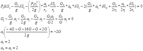 Решение ådА (F, Ф)=0 общее уравнение динамики 1) Возможное перемещение dS1 dj2 =dS1/2r2 dj3 =dS1/2 r3 dSc=dS1/2 Ф1 = (G1 /g)*a1 М2 (Ф)=J2x *e2 =((G2 /2g)*r3 2 ))*a1 /r2 Ф4 = (G4 /g)*a4 Ф2 = (G2 /g)*a2 М3 (Ф)= J3x *e3 = ((G3 /2g)*r3 2 )*a1 /2r3 a1 = a2 = a3 a4 = a1 /2 Составимобщееуравнениединамики G1 dS1-Ф1 dS1-М2 (Ф) dj2 – Ф4 dS1–2 (Ф2 dSc + М3 (Ф)dj3 )=0