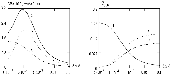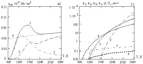 Рис.1. Температурные зависимости скоростей химических реакций пористой углеродной частицы в воздухе, плотностей химического тепловыделения, констант скоростей химических реакций, коэффициента массообмена, эффективной константы внутреннего реагирования и скорости стефановского течения а) 1 - б) 1 - в) 1 - г) 1- 3.2. Влияние диаметра частицы на скорости химического превращения и тепломассообмен. На рис. 2 (а-в) представлены кривые