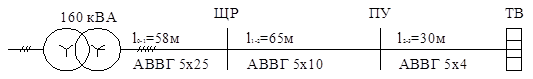 Рисунок 1.4 - Расчетная схема осветительной сети 1.7.11 Защита электрической сети от аварийных режимовК аварийным режимам в осветительных сетях относят: токи короткого замыкания, неполнофазный режим работы (для трёхфазной линии), токи утечки. Для защиты от токов короткого замыкания служат автоматические выключатели ВА 21-29 с номинальным током Ip =16А. 1.7.12 Расчёт и проверка сечения проводников электрической сетиПринимаем допустимые потери напряжения Δ U = 2,0% и коэффициент спроса Кс = 0,85. Тогда расчётное значение сечения проводника на участке, мм2 :