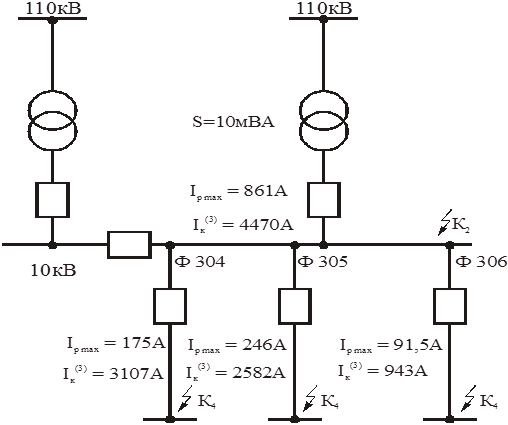 Рис. 7. Расчетная схема токов КЗ отходящих линий. Расчет токовых отсечек для отходящих линий. Селективность действия защиты достигается путем ограничения зоны действия защиты. Для этого ток срабатывания токовой отсечки мгновенного действия выбирают по условию: