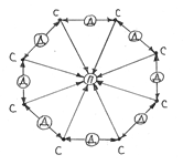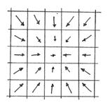 Рис. 9 Почему направления перемещения фаз являются определенными? Это обстоятельство объективно по причине уникальности каждого элементарного объема по времени появления. То есть, нет двух объемов, имеющих одинаковое время появления. Из этого следует, что если даже элементы массы будут как-то влиять на направление перемещения фаз, то из-за неповторимости каждого элементарного объема, направления перемещения также уникальны и их относительные устремления в целом неизменны. Потому, масса, начав свое бытие, обречена на разделение своих элементов на определенные группы, направление перемещения фаз которых стремиться к определенному центру. В тоже время, сами центры групп центростремительных фаз осуществляют относительное перемещения между собой. А что же происходит с метрикой элементарных объемов, перемещения пространственно-временные фаз которых ориентированы на один центр? Несомненно, что пространственная метрика сгруппированных по указанному признаку объемов начинает изменяться в соответствии с фазовыми колебаниями пространственной метрики каждого объема. Однако, из-за неповторимости фазы каждого объема, расширение и последующее сжатие пространственной метрики объемов будут происходить в строгой последовательности друг за другом по определенной схеме или порядку. Этот порядок будет устанавливаться из условия, что пространственная метрика сгруппированных элементарных объемов формируется таким образом, чтобы сдвиг фаз между объемами был наименьшим. Этот способ группирования объемов и образования в соответствии с этим пространственной метрики мне представляется в том виде, когда пространственная метрика сгруппированных объемов имеет центрально-симметричную структуру: исходное (первоначальное) состояния пространственной метрики находиться в центре, от которого в радиальных направлениях метрика изменяется до некоторого максимального значения. На плоскости пространственную метрику таких объемов можно изобразить, как показано на рисунке 10. В сгруппированных вокруг единого центра элементарных объемах пространственная метрика формируется из условия минимальности сдвига фаз, а сами фазы последовательно перемещаются от объема к объему, начиная от центра и до максимального значения расширения пространственной метрики, а, затем, в обратной последовательности.