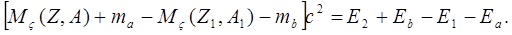 де індексами а і в позначені енергії відповідних частинок ЕА і ЕВ ; Е1 – кінетична енергія ядра-мішені; Е2 – кінетична енергія вихідного ядра. Згрупуємо енергії спокою в лівій частині, а кінетичні енергії – в правій: