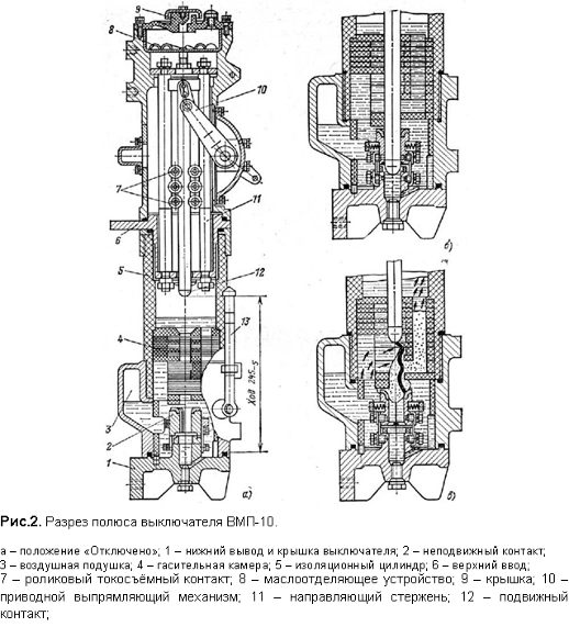 Неподвижный розеточный контакт расположен внутри крышки нижнего фланца. Подвижный контактный стержень подвешен к верхнему фланцу и связан с передаточным механизмом. Подвод тока к подвижному стержню осуществлён с помощью роликового устройства, создающего скользящее контактное соединение. Передаточный механизм и роликовое устройство размещаются в корпусе выключателя. Контакты снабжены тугоплавкими наконечниками, что значительно повышает их дугостойкость и значительно увеличивает срок службы. Внутри цилиндра, над розеточным контактом, расположена дугогасительная камера поперечного дутья. Камера представляет собой пакет круглых пластин из электрокартона, фибры и гетинакса. Верхняя часть камеры снабжена масляными карманами, а нижняя – тремя поперечными дутьевыми каналами, расположенными один над другим и сообщающими с помощью вертикальных каналов подкамерное пространство с верхней половиной бачка. Подкамерное пространство сообщается, кроме того, с добавочным резервуаром в виде стального стакана с воздушной подушкой, укреплённого на нижнем фланце бачка. Упругая воздушная подушка в стальном стакане сглаживает пульсацию давления в дугогасительной камере и убыстряет очищение её каналов от газов после окончания гашения дуги. Во включённом положении ток идёт по вводу, неподвижному розеточному контактному элементу, подвижному контакту и через роликовое устройство и направляющие неподвижные стержни выходит к верхнему вводу. При отключении выключателя, когда освобождается запирающее устройство привода, вал выключателя под действием отключающих пружин быстро поворачивается, поднимая контактный стержень вверх. Между контактами выключателя образуется дуга, вызывая газообразование в подкамерном пространстве. На первой стадии процесса отключения до момента открытия первой поперечной щели давление газов в подкамерном пространстве растёт (стадия замкнутого газового пузыря). На второй стадии щели поочерёдно открываются и возникает дутьё, направленное поперёк дуги, и дуга гаснет. Время гашения дуги при отключении больших и малых токов изменяется от 0,015 до 0,025 с. При отключении больших и средних токов образовавшаяся разность давлений между подкамерного пространства и верхней частью бачка оказывается достаточной для того, чтобы создать эффективное поперечное дутьё после открытия поперечных щелей. При отключении малых токов поперечное дутьё в каналах получается слабым, гашение дуги затягивается и завершается с помощью дополнительных радиальных струй дутья из масляных карманов в верхней части камеры. После окончания гашения дуги продолжается вытеснение мосла под действием упругой воздушной подушки из стального резервуара. В результате каналы камеры быстро очищаются от газов и камера подготавливается для работы в цикле АПВ. А процессе отключения газы, выходящие из бака, увлекают за собой частицы масла, которые задерживаются маслоотделителем и масло возвращается обратно в бак. Когда камера заполнится маслом, выключатель готов для выполнения следующего цикла операций. Бестоковая пауза при АПВ для этих выключателей довольно большая – 0,5 с. В выключателе ВМП-10 всего 4,5 кг масла, качество которого должно отвечать обычным требованиям к изоляционному маслу. Если масло будет сильно загрязнено, а каналы камеры 