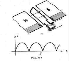 Принцип работы генератора постоянного тока основан на возникновении ЭДС в рамке, вращающейся в магнитном поле (Рис.6-1, а). За один оборот в каждой рабочей (активной) части рамки ЭДС дважды меняет знак. Чтобы ток во внешней цепи имел только одно направление (постоянное), применяют коллектор - два полукольца, соединенные с концами рамки, а рамку соединяют с внешней цепью через вращающийся коллектор и неподвижные щетки. Как только активная сторона рамки начнет пересекать линии магнитной индукции в противоположном направлении по сравнению предыдущим, соединенное с этой стороной полукольцо коллектора начнет соприкасаться с другой щеткой. Благодаря такому устройству направление тока во внешней цепи остается неизменным, хотя его значение изменяется (пульсирует, Рис.6-1, б). Устройство промышленного генератора постоянного тока изображено на рисунке 6-2. На внутренней поверхности станины I, изготовленной из цельного чугунного литья, жестко укреплены главные полюсы 2 с обмотками возбуждения и дополнительные полюсы с обмотками для компенсации ЭДС самоиндукции и реакции якоря.