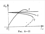 Генератор независимого возбуждения имеет обмотку возбуждения ОВ, подключаемую к постороннему источнику тока через регулировочный реостат (Рис.6-10, а). Напряжение на зажимах такого генератора (кривая I на Рис.6-11) с увеличением тока нагрузки несколько уменьшается в результате падения напряжения на внутреннем сопротивлении якоря, причем напряжения получаются всегда устойчивыми. Это свойство оказывается весьма ценным в электрохимии (питание электролитических ванн). Генератор параллельного возбуждения является генератором с самовозбуждением: обмотку возбуждения ОВ подключают через регулировочный реостат к зажимам того же генератора (Рис.6-10, б). Такое включение приводит к тому, что при увеличении тока нагрузки I, напряжение на зажимах генератора U" уменьшается из-за падения напряжения на обмотке якоря. Это, в свою очередь, вызывает уменьшение тока возбуждения и ЭДС в якоре. Поэтому напряжение на зажимах генератора UB уменьшается несколько быстрее (кривая 2 на Рис.6-11), чем у генератора независимого возбуждения. Дальнейшее увеличение нагрузки приводит к настолько сильному уменьшению тока возбуждения, что при коротком замыкании цепи нагрузки напряжение падает до нуля (небольшой ток короткого замыкания обусловлен лишь остаточной индукцией в машине). Поэтому считают, что генератор параллельного возбуждения не боится короткого замыкания. Генератор последовательного возбуждения