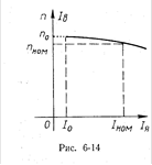 Схема включения двигателя постоянного, тока параллельного возбуждения через пусковой реостат ПР изображена на рисунке 6-13. Если обмотку возбуждения такого двигателя включить через регулировочный реостат РВ на напряжение другого источника, то получится двигатель независимого возбуждения. Скоростная характеристика n=f (Iя ) таких двигателей при U =const и Iв = const приведена на рисунке 6-14, для объяснения которой обратимся к формуле скорости двигателя (22):