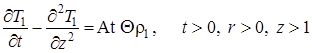 Безразмерный параметр At представляет собой отношение времени тепловой релаксации слоёв к среднему времени жизни радиоактивного нуклида. Выражение Pt является аналогом параметра Пекле, поскольку определяется аналогично последнему, но через температуропроводность настилающего, а не несущего пласта. Величина Для больших В силу большого значения аналога параметра Пекле (Рt ~ Аналогично, для настилающего и подстилающего пластов изменение радиальной составляющей температурного поля будет в значительной мере определяться конвективным переносом тепла в пористом пласте, что позволяет пренебречь для них вкладом соответствующих радиальных теплопроводностей. Таким образом, во всех уравнениях, получающихся из (1.4.1) – (1.4.3) исчезнут слагаемые, содержащие