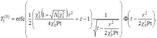 Последнее слагаемое в правой части уравнения (1.4.44) устанавливает изменение температуры за счёт энергии, выделяющейся при радиоактивном распаде. Отметим, что температурное поле в нулевом приближении определяется не значениями плотностей радиоактивного загрязнителя в точках, а усреднёнными значениями по вертикальной координате в интервале пласта. Как будет показано ниже, усреднённое таким образом значение плотности совпадает с нулевым приближением соответствующей задачи массопереноса (см. пункт 1.5.3). Для определения в нулевом приближении поля температур в среде, как следует из (1.4.44) – (1.4.50), необходимо задание функции плотности радиоактивного загрязнителя. Постановка этой задачи осуществлена в пункте 1.5, а её решению посвящена глава II. 1.3.3. Постановка задачи теплопереноса в первом приближенииУравнения (1.4.27), (1.4.28) для коэффициентов при