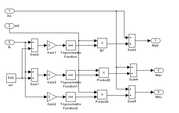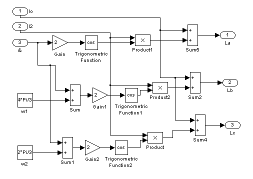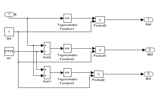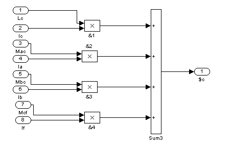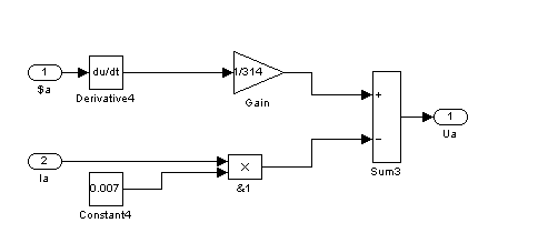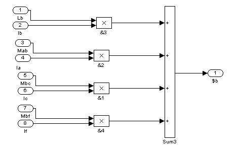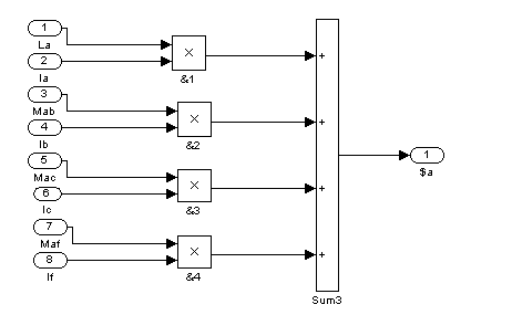 Рис. 6 – Пятый подблок первого суперблока, моделирующий 4. Моделирование взаимоиндуктивностей между обмоткой возбуждения и фазными обмотками