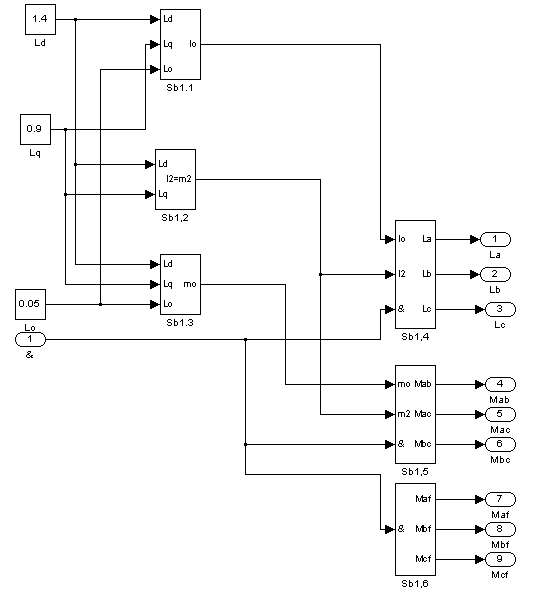 Рис. 9 – Первый суперблок (Sb1) II. Реализация 2 - 5 суперблоков Согласно системе уравнений (2) моделируем потокосцепления, связанные с соответствующими обмотками.
