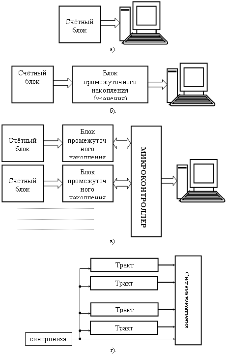 Независимо от способа построения системы регистрации в её структуру входят счётный блок, производящий подсчёт импульсов с детектора γ-излучения, и непосредственно блок накопления. Счётный блок – производит подсчёт приходящих со спектрометрической линейки импульсов и выдачу их в блок накопления. Он входит в любую систему регистрации и его схема может быть везде одинаковой. Он может быть реализован как стандартный модуль. Другое дело блок накопления. Так как его создание вызывает не мало затрат (как в инженерном так и в экономическом плане) необходимо заранее ясно представлять все требования к нему. Здесь имеется несколько подходов. Их различия заключены в степени использования ресурсов компьютера. Простейший вариант системы накопления реализован с использованием только ЭВМ, которая в данном случае выполняет функции и накопления и хранения. Такую систему принято называть одноуровневой (рис.2.2а). Одноуровневая система требует для своего создания минимальных аппаратурных затрат. Здесь промежуточное накопление как таковое отсутствует. Данные сразу передаются в компьютер. Очевидно, что компьютер должен быть способен постоянно (каждые 16 микросекунд) принимать информацию со счетного блока. В такой системе компьютер постоянно занят операциями сбора и накопления и другое его использование вряд ли возможно. Кроме того, под вопрос ставится возможность реализации многоканальных систем. Более эффективной с точки зрения использования временных ресурсов ЭВМ является двухуровневая модель систем накопления. Здесь возможны два варианта построения таких систем: с использованием микроконтроллера или без него (рис.2.2б). При использовании блока промежуточного хранения электронная часть берет на себя лишь функции сбора и промежуточного хранения данных, а накопления осуществляется в ЭВМ. Промежуточное хранение данных необходимо, как для упрощения обмена данными с компьютером (используя одно прерывание можно передать весь блок информации, собранный за рабочий цикл), так и для более эффективного использования времени компьютера, и его ресурсов [4]. Несмотря на снижение степени загруженности компьютера, его постоянное присутствие в тракте регистрации всёже необходимо. Другой вариант подразумевает использование, в качестве второго уровня системы накопления, блока промежуточного накопления с применением микроконтроллера. Такое построение требует от микроконтроллера повышенного быстродействия и достаточно большого объема памяти внешнего ОЗУ. В этом случае всю систему можно рассматривать как одноуровневую по отношению к микроконтроллеру. В зависимости от быстродействия микроконтроллера его применение может быть не ограничено только задачами накопления данных: на него могут быть возложены функции управления некоторыми узлами системы регистрации. Оптимальным способом исполнения одно- и двухуровневых систем можно считать их изготовление в виде встраиваемых плат расширения (адаптеров). Такие системы могут с успехом применятся в одноканальных системах накопления. Допустимо построение и многоканальных систем с небольшим числом трактов в пределах аппаратных возможностей компьютера или микроконтроллера. Однако не все требования, предъявляемые к многоканальным системам накопления, могут быть при этом удовлетворены. Пол