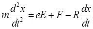 Здесь m – масса электрона, e – его заряд, R – параметр, характеризующий затухание электронных колебаний, eE – сила действующая на электрон со стороны поля, F – сила, действующая на электрон со стороны атомного ядра (возвращающая сила ядра):