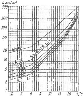 Рис.1. Зависимость гидратообразования от температуры и давления насыщенного парами воды природного газа Условия образования гидратов с различной относительной плотностью можно определить по графику [1] на рис.2.