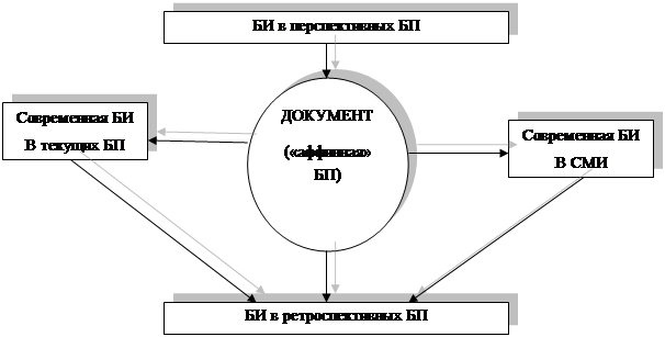 БИ – библиографическая информация БП – библиографическое пособие Рис. 1 Библиографическая информация – сателлит документа В процессах движения библиографическая информация неоднократно преобразуется, дополняется или сокращается, принимает различные формы. Документ как объект библиографического отражения остается неизменным, а информация о нем меняется. Сообщение об одном документе объединяется с другими в бесконечно многообразных комбинациях. Авторы, возможно, друг друга терпеть не могли, а библиография то и дело сводит их воедино. Оценки документа в аннотациях могут меняться на противоположные. Однако зафиксированная материально библиографическая информация остается неизменной и обретает свойства документированной информации. Ей присуще состояние покоя. В определенных областях деятельности смена библиографической информации отражает процессы старения и обновления документов. Такая необходимость имеется в сферах управления, нормативного регулирования социальной деятельностью. Соответствующие информационные службы регулярно составляют и публикуют списки действующих и отмененных правовых актов, действующих стандартов, строительных норм и других нормативных документов. При этом зафиксированная хотя и устаревшая библиографическая информация сохраняет ценность источника изучения истории права и других областей знания. Подлинное движение библиографической информации проявляется в бесконечно многообразных повторяющихся в новом виде и возникающих заново сцеплениях авторов и персоналий, идей, тем, проблем, фактов в библиографическом отражении. Понятия массив и поток библиографической информации отчасти соответствуют состояниям ее покоя и движения. Большей определенностью обладает поток. Он воплощен в продукции текущей библиографии. Подобно документному потоку (журналам и газетам) поток библиографической информации отражает движение ушедшего и настоящего времени. Современным является последний по времени выпуск текущего библиографического пособия. Массив библиографической информации воплощен в продукции ретроспективной библиографии. 2.1 Форма библиографической информации Библиографическая информация дискретна. Это означает, что она состоит из отдельных элементов. Предельными элементами библиографической информации, ее условными атомами являются библиографические записи. Известно, что (от греч. atomos – неделимы) состоит из ряда электронов и множества части последних. Библиографическая запись также состоит из десятков элементов, но они в отдельности (автор, заглавие, издательство и др.) или в списках, во вспомогательных указателях библиографическую информацию не образуют. Библиографическая запись является исходной формой существования библиографической информации. Библиографическая запись представляет собою совокупность сведений об объекте библиографического отражения, служащих целям его идентификации, информирования о нем и поиска его. Таковым объектом обычно является документ, но им, как отмечено выше, может быть фрагмент документа либо связная совокупность документов. Применяя для анализа сущности библиографической записи метод моделирования, ученые пришли к выводу, что она представляет собой форму свертывания и формы документа, результат их предельного сжатия. Но на биб