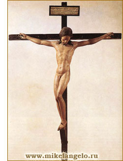 Совершенно необычным для наших представлений о Микеланджело оказалось известное по источникам, но лишь недавно опознанное деревянное полихромное распятие для ризницы во флорентийской церкви Сан Спирито. Голова Христа с закрытыми глазами опущена на грудь, ритм тела определяется скрещенными ногами. Тонкость этого произведения отличает его от мощи фигур мраморного рельефа. Здесь молодой мастер следовал распространенному в Италии ХV века типу распятия, восходящему ко временам готики и потому выпадающему из круга наиболее передовых исканий скульптуры конца кватроченто. Покровитель и постоянный заказчик Микеланджело Лоренцо Великолепный умер в 1492 году. Два года спустя из-за опасности вторжения французов, осенью 1494 г. художник на время перебрался в Болонью, затем в Венецию. В Венеции он живет до 1494 года, а потом в снова переезжает в Болонью. В Болонье Микеланджело изучает творения Данте и Петрарки, под воздействием канцон которого начинает создавать свои первые стихи. Сильное впечатление произвели на него рельефы церкви Сан Петронио, исполненные Якопо делла Кверча. Здесь же Микеланджело исполнил три небольшие статуи для гробницы Св. Доминика, работа над которой была прервана из-за смерти начавшего ее скульптора. «За несколько недель до изгнания Медичи из Флоренции Микеланджело уехал в Болонью, а потом в Венецию, опасаясь, ввиду близости его к этому роду, как бы и с ним не произошло какой-либо неприятности, так как и он видел распущенность и дурное правление Пьеро деи Медичи. Не найдя занятия в Венеции, он возвратился в Болонью, где по оплошности с ним приключилась беда: при входе в ворота он не взял удостоверения на выход обратно, о чем для безопасности был издан мессером Джованни Бентивольи приказ, в котором говорилось, что иностранцы, не имеющие удостоверения, подвергаются штрафу в 50 болонских лир. На попавшего в такую неприятность Микеланджело, у которого заплатить было нечем, случайно обратил внимание мессер Франческо Альдовранди, один из шестнадцати правителей города. Когда ему рассказали, что случилось, он, сжалившись над Микеланджело, освободил его, и тот прожил у него более года. Как-то Альдовранди пошел с ним посмотреть на раку св. Доминика, над которой, как рассказывалось раньше, работали старые скульпторы: Джованни Пизано, а после него мастер Никола д'Арка. Там не хватало двух фигур высотой около локтя: ангела, несущего подсвечник, и св. Петрония, и Альдовранди задал вопрос, решится ли Микеланджело их сделать, на что тот ответил утвердительно. И действительно, получив мрамор, он выполнил их так, что стали они там фигурами самыми лучшими, за что мессер Франческо Альдовранди распорядился уплатить ему тридцать дукатов. В Болонье Микеланджело провел немногим больше года и остался бы там и дольше: такова была любезность Альдовранди, который полюбил его и за рисование, и потому, что ему, как тосканцу, нравилось произношение Микеланджело и он с удовольствием слушал, как тот читал ему творения Данте, Петрарки, Боккаччо и других тосканских поэтов» Вазари. Микеланджело пробует свои силы в разных творческих задачах, в дополнениях к уже существующему скульптурному ансамблю Бенедетто да Майяно надгробию Св. Доминика в церкви Сан Доменико в Болонье, для которого он создал небольшие по размеру мраморные статуи: - небольшие мраморн