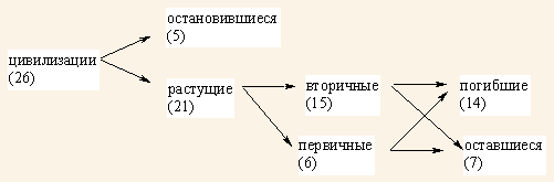 Рис. 1. Типология цивилизаций (по А.Тойнби) Чаще всего при выделении типов цивилизаций используют конфессиональный критерий, считая именно религию концентратом культурных ценностей. Так, по Тойнби, в 20 в. существует 7 цивилизаций - западная христианская, православная христианская, исламская, индуистская, конфуцианская (дальневосточная), буддийская и иудаистская. Другая слабая сторона цивилизационного подхода, снижающая его привлекательность, - это отрицание прогресса в развитии общества (либо, по крайней мере, подчеркивание его однородности). Например, по П.Сорокину, общество постоянно вращается внутри цикла «идеациональная культура - идеалистическая культура - чувственная культура» и не в силах выйти за его пределы (рис. 1). Такое понимание развития общества довольно органично для обществ Востока, в чьих культурных традициях доминирует образ циклического времени, но мало приемлемо для западных обществ, в которых христианство приучило к образу линейного времени.