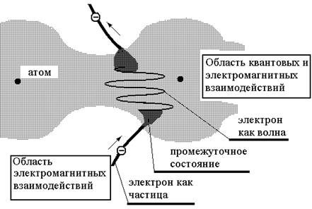 где: q – величина заряда; v – скорость перемещения зарядов; l – расстояние между зарядами; θ – угол между вектором скорости и l (как показано на рис.3). Наличие вращающего момента, как утверждали авторы, позволило бы определить наличие “эфирного ветра” или движения эфира относительно Земли. Эксперимент дал отрицательный результат. Причина в том, что скорость движения эфира не входит в уравнение. С тем же успехом мы могли бы объяснить вычисленный вращающий момент влиянием Господа Бога. Его параметры также не входят в уравнение движения. Следует заметить, что в системе отсчета, где заряды покоятся, никакого вращающего момента нет. Мы видим субъективность в объяснении явления. Объяснение зависит от того, какую систему отсчета выберет себе наблюдатель. Соответственно, инерциальные системы уже не могут рассматриваться как эквивалентные. Эта гносеологическая ошибка есть результат шаблонного (догматического) переноса ошибочных представлений из Специальной теории относительности в классическую механику. Объяснение в рамках ньютоновской механики можно найти в [4] Пример3. Отождествление различных свойств. Мы знаем, что масса, как материальный объект, имеет инерциальные и гравитационные свойства. Гравитационное свойство есть способность материальных тел притягиваться друг к другу. Это свойство определяется через гравитационную массу mg . Инерциальное свойство есть способность материального тела противодействовать изменению своей скорости при воздействии на тело силы. Оно характеризуется инерциальной массой mi . Эйнштейн выдвинул гипотезу об эквивалентности инерциальной и гравитационной масс (mi = mg ). Исходя из принципа конкретности истины, мы можем утверждать, что эквивалентность (пропорциональность) должна иметь границы применимости, за которыми она будет нарушена. Если же мы упорно будем отстаивать эту гипотезу, игнорируя принцип конкретности истины, мы неминуемо впадем в догматизм, проповедуя абсолютную истину (mi = mg ), которая имеет место всегда и без исключений. Это гносеологическая ошибка. Итак, отождествление различных свойств, принадлежащих одному материальному объекту, есть неправомерная процедура, приводящая к гносеологической ошибке. Более разумно было бы именовать гравитационную массу гравитационным зарядом по аналогии с электродинамикой. Такой подход подрывает основы Общей теории относительности. Но он не противоречит логике применения философских категорий и принципу конкретности истины. Пример 4. Отождествление взаимоисключающих свойств . Речь идет об отождествлении взаимоисключающих свойств, принадлежащих одному объекту (корпускулярно-волновой дуализм). Как известно, корпускула и волна имеют взаимоисключающие свойства. Например, инерциальная масса покоя заряда отлична от нуля, а масса покоя волны всегда равна нулю. Корпускула не может иметь одновременно нулевую и отличную от нуля массу покоя. Дуализм волны и частицы имеет трудности в интерпретации именно потому, что не установлены границы проявления этих свойств, как того требует принцип конкретности истины. Покажемвыход из этого противоречия. Пусть электрон проходит через одноатомную пленку, как показано на рис.4. Когда электрон движется в области электромагнитных взаимодействий, мы должны рассматривать его как частицу. Вероятность обнаружи