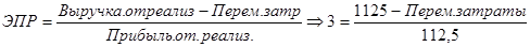 Вывод: Порог рентабельности характеризует достижение такого объема производства, при котором достигается окупаемость постоянных и переменных затрат. В нашем примере предприятия, снизив выручку на 500 тыс. руб., не получит прибыли и не понесет убытков. Это означает, что предприятие способно выдержать снижение выручки от реализации на 33,3 % без серьезной угрозы для своего финансового положения. 3. В1 = В – 0,25 В = 15000 – 0,25 * 1500 = 1125 тыс. руб ЭПР = 3 П1 = 0,75 П = 0,75 * 150 = 112,5 тыс. руб.