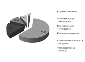 Рисунок 1 – Структура капитальных вложений в основные производственные фонды Основную долю в структуре капитальных вложений занимают капитальные вложения в рабочие машины и оборудования, затем капитальные вложения в здания и сооружения , менее всего капитальных вложений в технологическую оснастку. На основе данных таблицы строим круговую диаграмму, отражающую структуру амортизационных отчислений (рисунок 2)