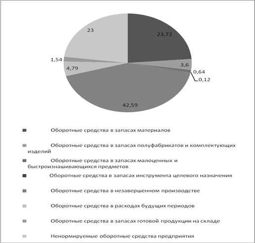Рисунок 3 – Структура себестоимости продукции 4. Расчет величины капитальных вложений в оборотные средства предприятия (цеха)Оборотные средства состоят из: · оборотных фондов (производственные запасы, незавершенное производство, расходы будущих периодов); · фондов обращения, (готовая продукция на складах предприятия, товары отгруженные, находящееся в пути к потребителю, средства в расчетах с потребителями, дебиторская задолженность, денежные средства на счету предприятия). В курсовой работе в соответствии с исходными данными можно рассчитать величину оборотных средств необходимую для создания производственных запасов основных материалов, покупных полуфабрикатов и комплектующих изделий, малоценных и быстроизнашивающихся предметов, незавершенного производства, расходов будущих периодов, готовой продукции на складе, что составляет около 70 % от общей величины необходимых оборотных средств. 4.1 Определение величины оборотных средств в запасах материаловВ составе производственных запасов входят следующие элементы: · основные материалы; · вспомогательные материалы; · топливо. Потребность в оборотных средствах для создания производственных запасов определяется по формуле: