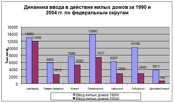 Так, в 2002 году было ведено 33,8 млн.кв.м. (54,7% к уровню 1990г.), в 2003 году – 36,3 млн.кв.м. (58,8%), в 2004 году – 38,2 млн.кв.м. (61,9%). В общем объеме вводимых в действие жилых домов значительно увеличилась доля жилых домов, построенных населением за свой счет и с помощью кредитов – с 9,7% в 1990г. (6,0 млн.кв.м.) до 40,6% в 2004г. (15,5 млн.кв.м). При этом в Центральном федеральном округе темпы ввода в действие жилых домов в 2004году к уровню 1990 года составили 85,3%, в Южном – 69,6%, в Приволжском – 53,8%, в Уральском – 45,6%, в Северо-Западном – 44,6%, в Сибирском – 27,9%, в Дальневосточном – 19,6% (диаграмма 4).[8] Диаграмма 4