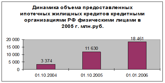 Наблюдается значительный интерес со стороны банков к кредитованию физических лиц в целом и жилищному кредитованию в частности. Данную тенденцию можно объяснить сразу несколькими факторами. Рынок кредитования корпоративных клиентов давно поделен, большие компании крайне редко готовы сменить свой банк, с которым налажены долгосрочные партнерские отношения, и это заставляет банки искать новые пути развития бизнеса. В то же время сегодня люди готовы воспользоваться банковскими услугами. Объем услуг, предоставляемых физическим лицам, постоянно растет. Исходя из данных, приведенных в табл. 4 видно, что объемы предоставленных ипотечных жилищных кредитов постоянно увеличиваются (диаграмма 6). Так, объем выданных ипотечных кредитов на 1.10.05г. вырос по сравнению с объемом на 1.10.04г. на 535 397 млн. руб. и составил 856 531 млн. руб.; на 1.01.06г. увеличился на 356 340 млн. руб. по сравнению с объемом на 1.10.05г. и составил 1 212 871 млн. руб. В общем объеме выданных кредитов, ипотечные жилищные кредиты составляют на 1.10.04г. – 1,05%; на 1.10.05г. – 1,36%; на 1.01.06г. – 1,52%. Т.е. наблюдается увеличение доли ипотечных кредитов в общем объеме выданных кредитов физическим лицам. Диаграмма 6