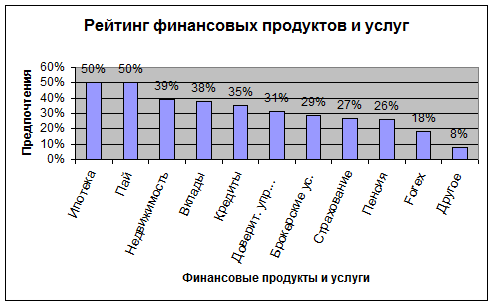 Операторы рынка акцентируют свое внимание на адаптации существующих ипотечных продуктов к запросам и создании новых продуктов, наиболее полно отвечающих современным рыночным требованиям, пытаясь сделать ипотеку наиболее привлекательной для потребителя. Успех или неудача таких попыток зависит, прежде всего, от самих участников рынка, операторов, которые и создают правила игры. В настоящее время на рынке существует ряд конкурирующих схем ипотеки. Ключевым звеном являются, как правило, банки или фонды (ипотечные агентства). Отобрав по установленным критериям “смежников” (риэлтеров, страховщиков, оценщиков и т. д.), создав с ними на основе выбранной ипотечной схемы своего рода замкнутый “производственный цикл”, они начинают конкурировать с себе подобными. Но, мало только отобрать смежников, необходимо выстроить с ними определенную схему взаимодействия. Так, на российском рынке недавно появился принципиально новый подход, когда банк работает с заемщиком не напрямую, а через риэлтера и видит заемщика только на стадии подписания кредитного договора. В результате работы сотрудников риэлтерского агентства клиент и банк быстрее находят друг друга. По оценкам аналитиков, из 100 человек, обратившихся в банк напрямую, реально жилищный кредит получают только 10. А в том случае, если заемщик обратился к риэлтерам, его шансы возрастают до 90%. Кроме того, крупные операторы рынка недвижимости проверяют юридическую чистоту квартиры самостоятельно: проводят полный детальный анализ всех сделок купли-продажи и обмена, бывших и настоящих собственников квартиры, которую вы хотите приобрести и т. д. Какие бы схемы ипотечного кредитования не предлагались операторами рынка, в подавляющем большинстве случаев ипотечные кредиты формируются по “затратному” принципу, т. е. в услугу закладываются всевозможные производственные и иные издержки, желаемая норма прибыли и с этим выходят на рынок. После этого возникает вопрос, почему же отечественная ипотека не становится массовой. Законы продвижения услуги на массовый рынок сами по себе, ипотечное кредитование – само по себе. У рынка однозначно есть потенциал развития. Интерес со стороны потребителей к ипотеке постоянно растет. И об этом свидетельствуют данные, собранные по Всероссийской выставке “Финансовый супермаркет для населения”. Выставка “Финансовый супермаркет для населения”, проведенная в Москве 2006г. лишний раз доказывает то, что из всех финансовых продуктов, которые были там представлены, основное внимание было сосредоточено на ипотеке и паевых фондах (диаграмма 8). Можно сказать, что ипотека в условиях рынка пока еще только набирает обороты, интерес к ней со стороны банков, инвесторов и населения довольно высок. Но пока в этой области остается множество нерешенных вопросов. Диаграмма 8